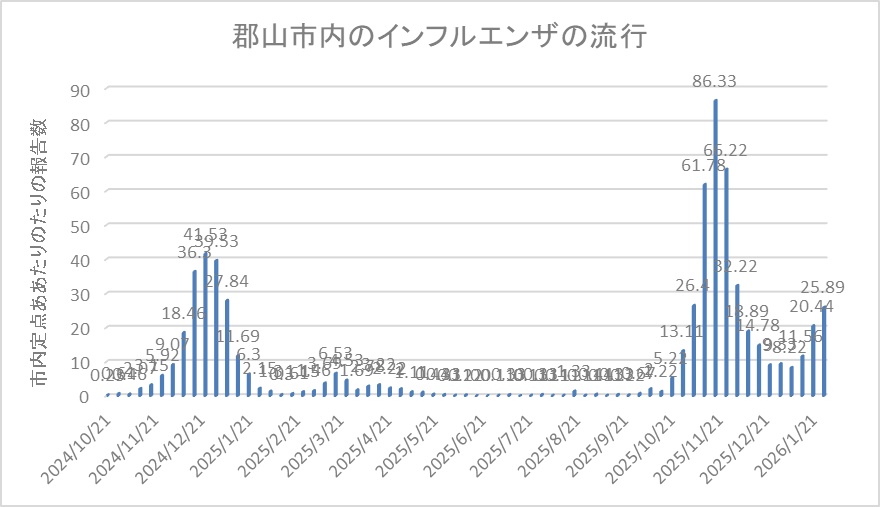 インフルエンザの報告が増加中です。先週は県全体で定点当たり33.02名と30名を超えたので警報レベルの流行となりました。先々週は15.50でした。郡山市は先週定点当たり25.89名の報告があり、注意報レベルが続いています。先々週は20.44名でした。B型インフルエンザの報告がほとんどです。