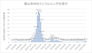 インフルエンザの報告が出始めました。郡山市は先週定点当たり1.22名の報告がありました。定点当たり1名を超えると流行が始まったと判断します。県全体では定点当たり3.17名でした。