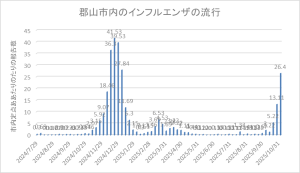インフルエンザの報告が一気に増え、先週は県全体で定点当たり34.63名と30名を超えたので警報レベルの流行になりました。郡山市は先週定点当たり26.44名の報告があり30名には達していません。先々週は13.11名でした。
