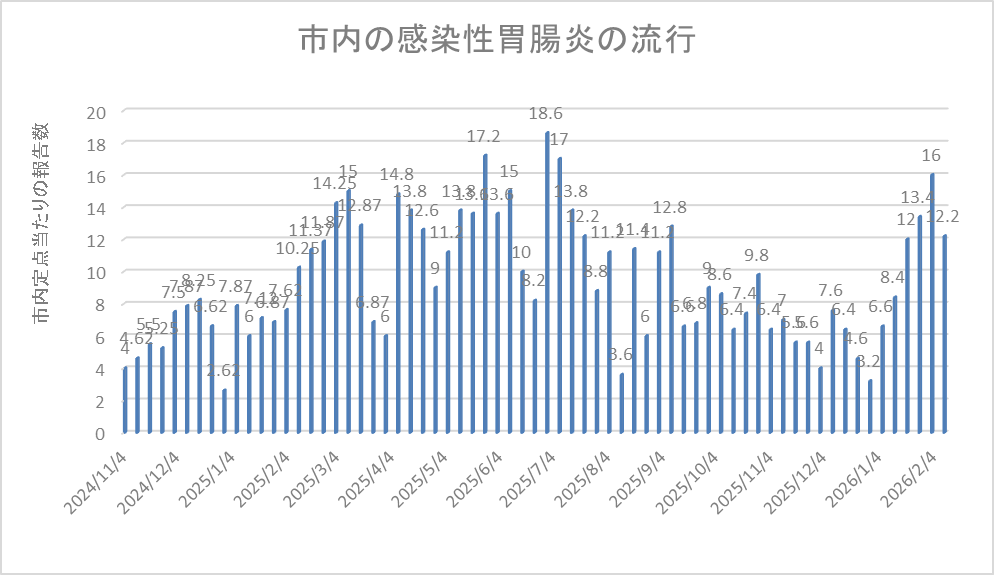 百日咳の報告は減少が続いています。激しい咳が出て、長引くのが特徴です。乳児がかかると重症になり、生後6か月以下では死に至る危険性も高いです。感染性胃腸炎が郡山市で小流行中です。