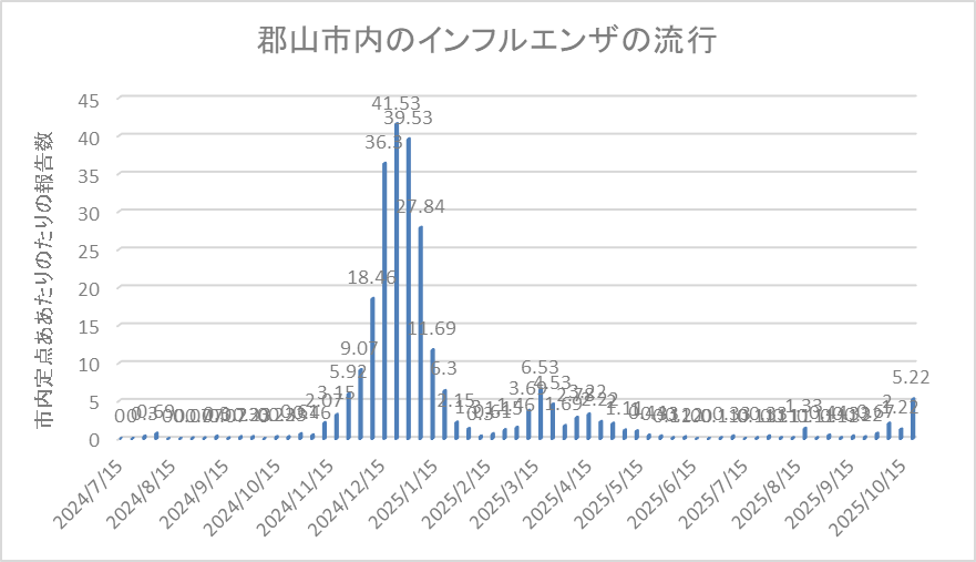 インフルエンザの報告が出始めました。郡山市は先週定点当たり1.22名の報告がありました。定点当たり1名を超えると流行が始まったと判断します。県全体では定点当たり3.17名でした。
