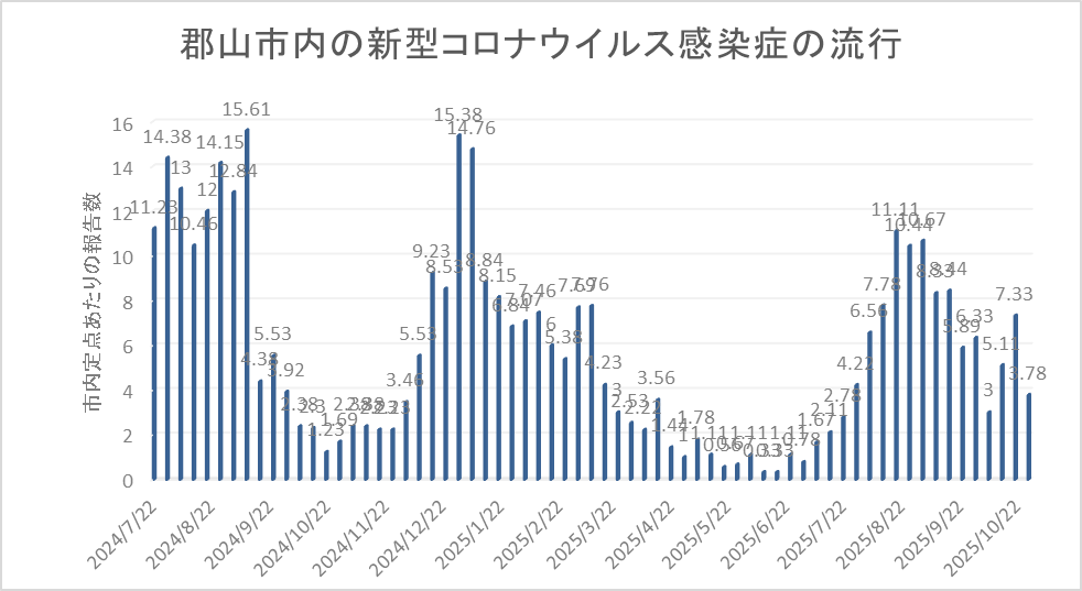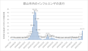 インフルエンザの流行が始まっていましたが、先週県全体で定点当たりの報告数が15.97名と10を超えたので注意報レベルの流行となりました。郡山市は先週定点当たり13.11名の報告があり10を超えました。先々週は5.22名でした。
