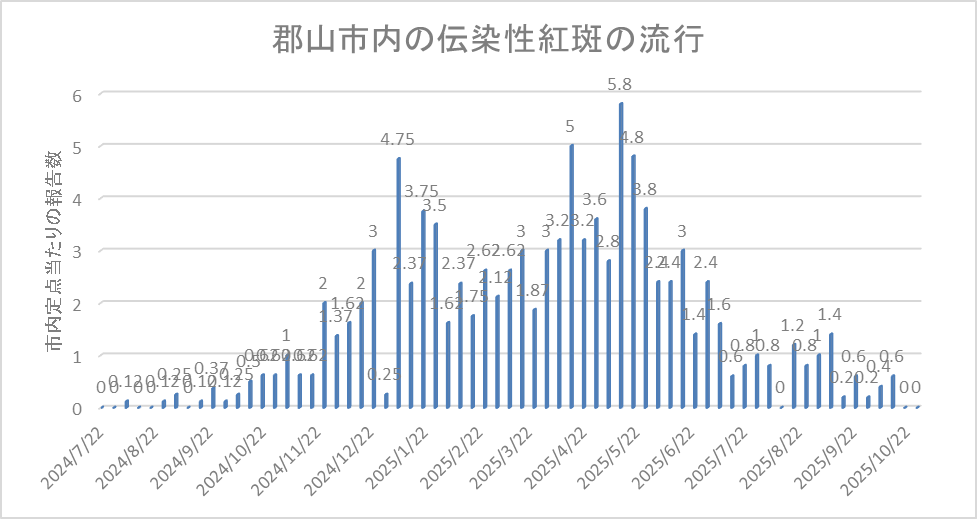 新型コロナウイルス感染症の報告が続いていますがやや減少してきています。百日咳の報告は続いています。先週郡山市では7名の報告がありました。先々週は5名でした。年齢は学童から10代がほとんどです。激しい咳が出て、長引くのが特徴です。乳児がかかると重症になり、生後6か月以下では死に至る危険性も高いです。伝染性紅斑(りんご病)の流行は終息しそうですが、報告は続いています。ほっぺがリンゴのように赤くなるので、りんご病とも呼ばれます。他に太ももや腕に赤い斑点が出ます。熱は出ません。発疹が出た時点で体からウイルスは消えているので感染力はありませんので、登校登園は可能です。妊娠中の方がかかると、まれに胎児の異常や流産する可能性があり注意が必要です。