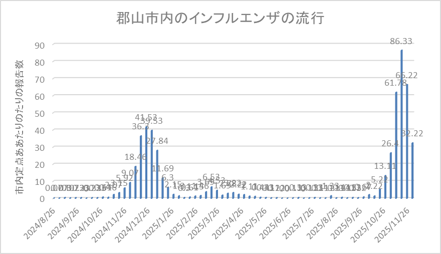 インフルエンザが警報レベルで流行を続けていますが減少中です。先週は県全体で定点当たり32.02名と警報レベルの30名を超えていますが先々週の64.81名よりは減少しました。郡山市は先週定点当たり32.22名の報告がありました。先々週は64.22名でしたので減少しました。