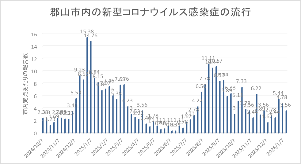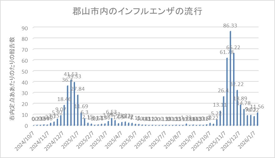 減少を続けていたインフルエンザの報告が先週増加しました。先週は県全体で定点当たり7.92名と小流行中です。先々週は7.35名でしたので少し増えました。郡山市は先週定点当たり11.56名の報告があり、注意報レベルになりました。先々週は8.22名でした。B型インフルエンザの報告が増えているようです。