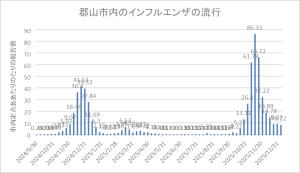 インフルエンザは減少を続けています。先週は県全体で定点当たり7.35名と小流行中です。先々週は9.71名でした。郡山市は先週定点当たり8.22名の報告がありました。先々週は9.33名でしたので減少しています。