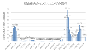 B型インフルエンザは注意報レベルで流行中です。先週は県全体で定点当たり13.54名と30名を下回り警報レベル下回りましたが注意報レベルは続いています。先々週は14.29でした。郡山市は先週定点当たり12.33名の報告があり,注意報レベルの流行です。先々週は13.56名でした。