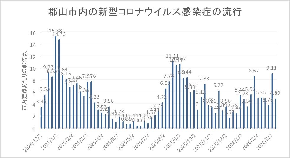 百日咳の報告は減少が続いています。激しい咳が出て、長引くのが特徴です。乳児がかかると重症になり、生後6か月以下では死に至る危険性も高いです。郡山市内では流行していませんが、RSウイルス感染症が県北、県南、会津地区で流行しています。県内では報告はありませんが麻しん(はしか)の報告が増加しています。麻しんの感染力は極めて強く免疫後持たない方が感染するとほぼ100%発症します。肺炎や脳炎を合併することがあり、1000人に1人死亡します。予防にはワクチンの接種が重要です。